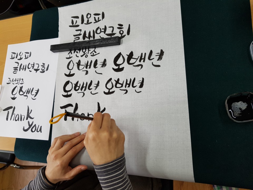 기본자를 변형하여 쓰는 방법에서 먹의 농도를 이용아혀 표현하는 기법과 채색하여 명암을 넣는등 등근글씨의 힘 조절해서 쓰는 방법을 배우는 시간이었습니다.