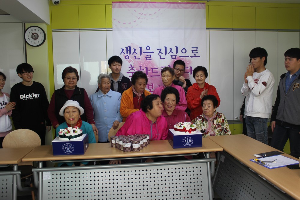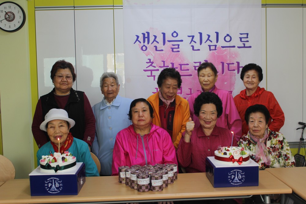 2017년 4월 15일(토), 4월에 생일을 맞이하신 무료급식 서비스 이용 어르신들을 축하해드리는 생월잔치를 진행하였습니다.