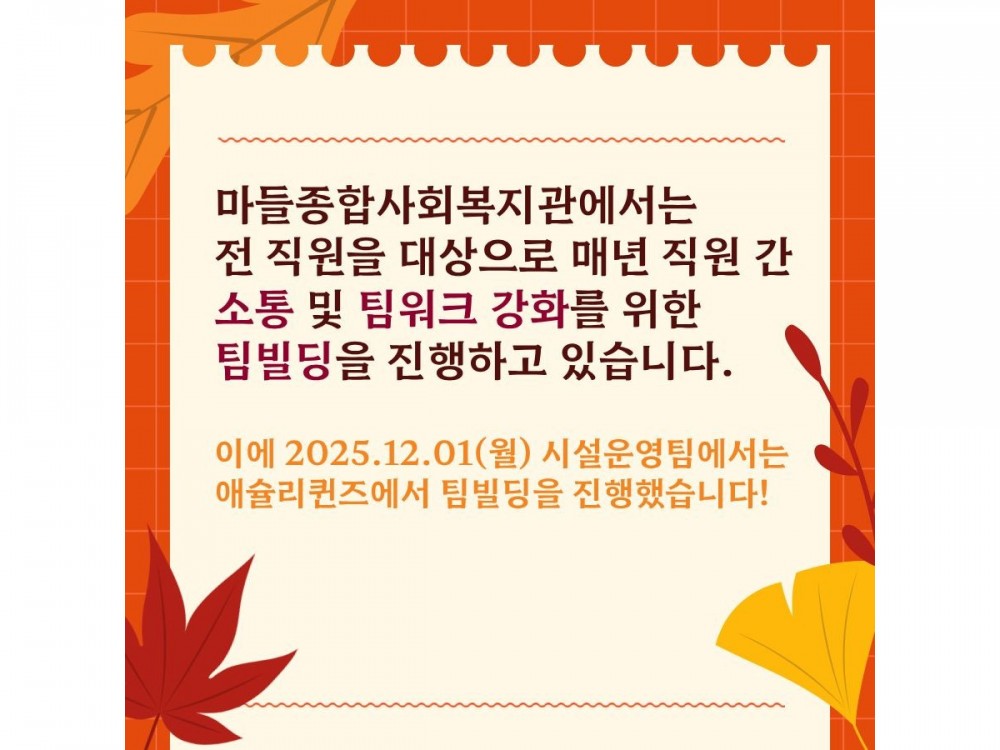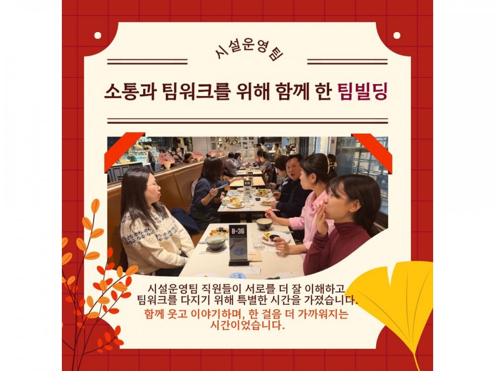 2025 시설운영팀 팀빌딩 페이지 정보 작성자 시설운영팀 작성일25-12-02 00:23 조회184회 댓글0건 관련링크 이전글 다음글 목록 본문 댓글목록 등록된 댓글이 없습니다. 이전글 다음글 목록