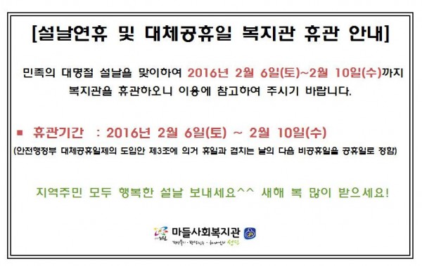 설날연휴 및 대체공휴일 휴관안내 페이지 정보 작성자 마들사회복지관 작성일16-02-02 16:43 조회10,540회 댓글0건 관련링크 이전글 다음글 목록 본문 댓글목록 등록된 댓글이 없습니다. 이전글 다음글 목록