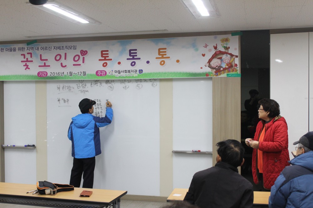 2016년 2월 18일(목), 꽃노인의 통.통.통.의 첫 공식 활동인 2월 자치회의가 진행되었습니다. 이번 자치회의를 통해 구성원 중 임원으로 활동할 회장, 부회장, 총무, 부총무를 선출하고 활동 시 규칙사항들을 정하는 시간을 가졌습니다. 또한 신규인원과 기존인원이 서로 인사하면서 소개함으로써 친해질 수 있는 기회가 되었습니다. 앞으로 아침밥 나눔, 연합활동, 문화체험활동 등 다양한 활동을 통해 지역사회와 통합하고, 1-3세대가 통합하고, 활동 구성원이 통합하여 즐거운 마을을 만들어 갈 수 있는 어르신들을 많이 기대해 주시고 응원부탁드립니다.