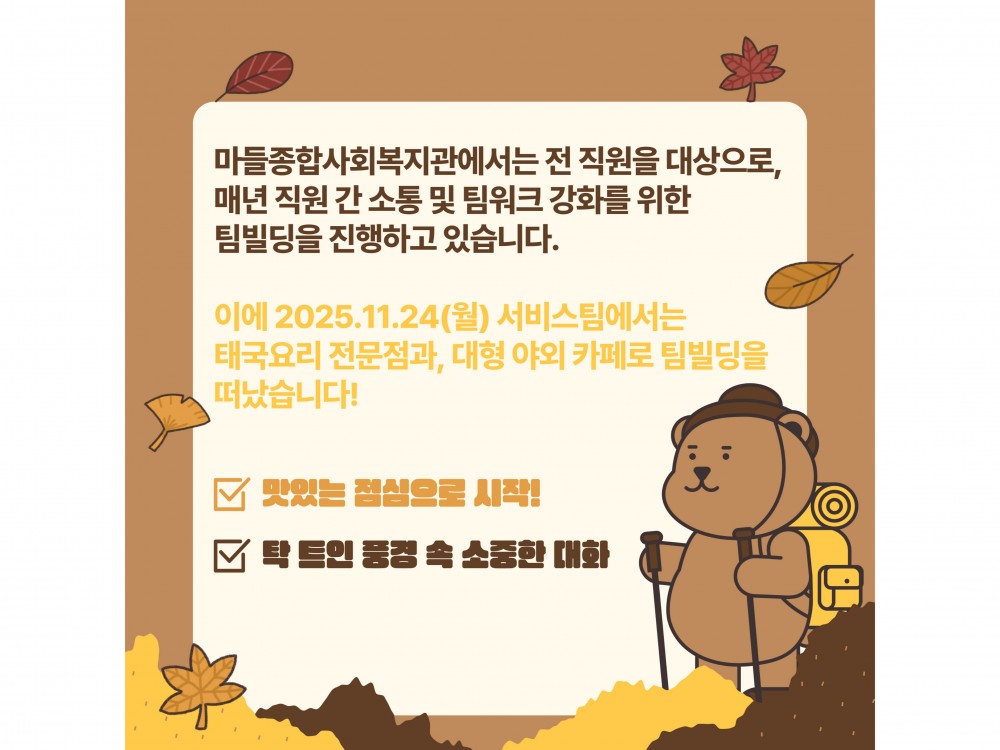 2025 서비스팀 팀빌딩 페이지 정보 작성자 서비스팀 작성일25-11-27 19:57 조회193회 댓글0건 관련링크 이전글 다음글 목록 본문 #크리스마스 #붕세권 #연말* 이 디자인은 미리캔버스에서 작업되었습니다.(https://www.miricanvas.com) 댓글목록 등록된 댓글이 없습니다. 이전글 다음글 목록