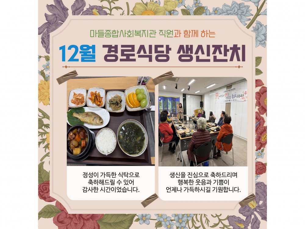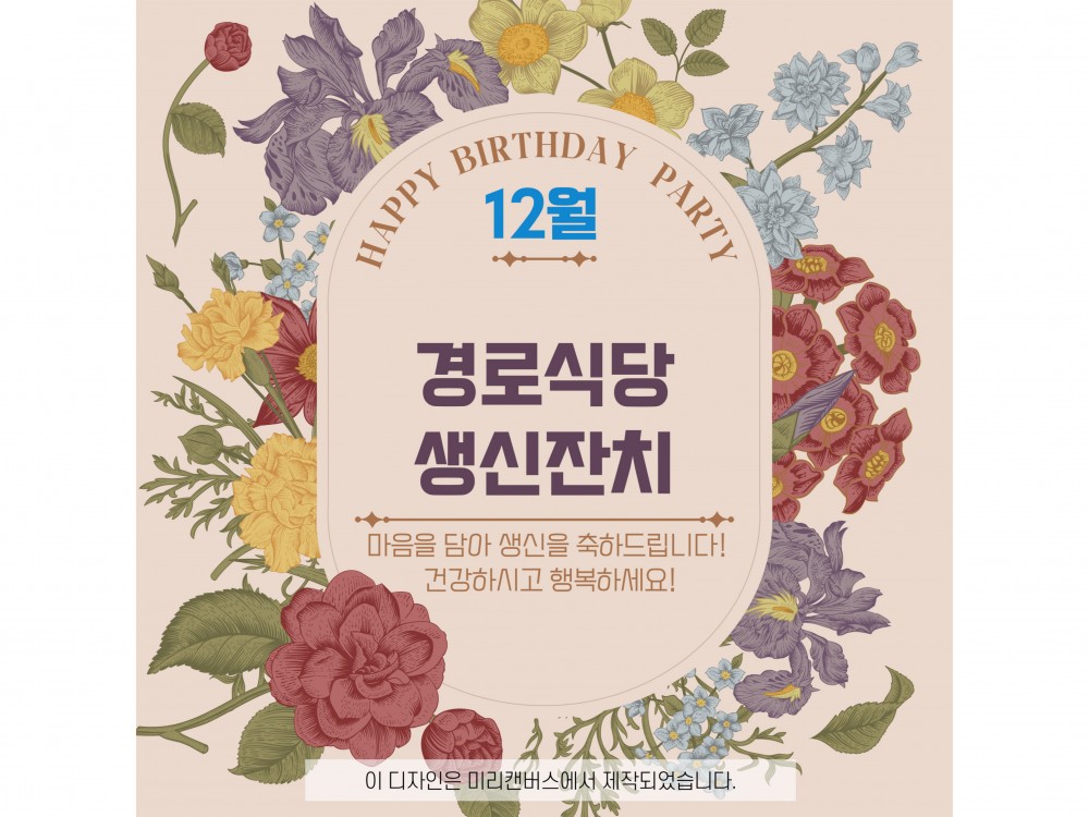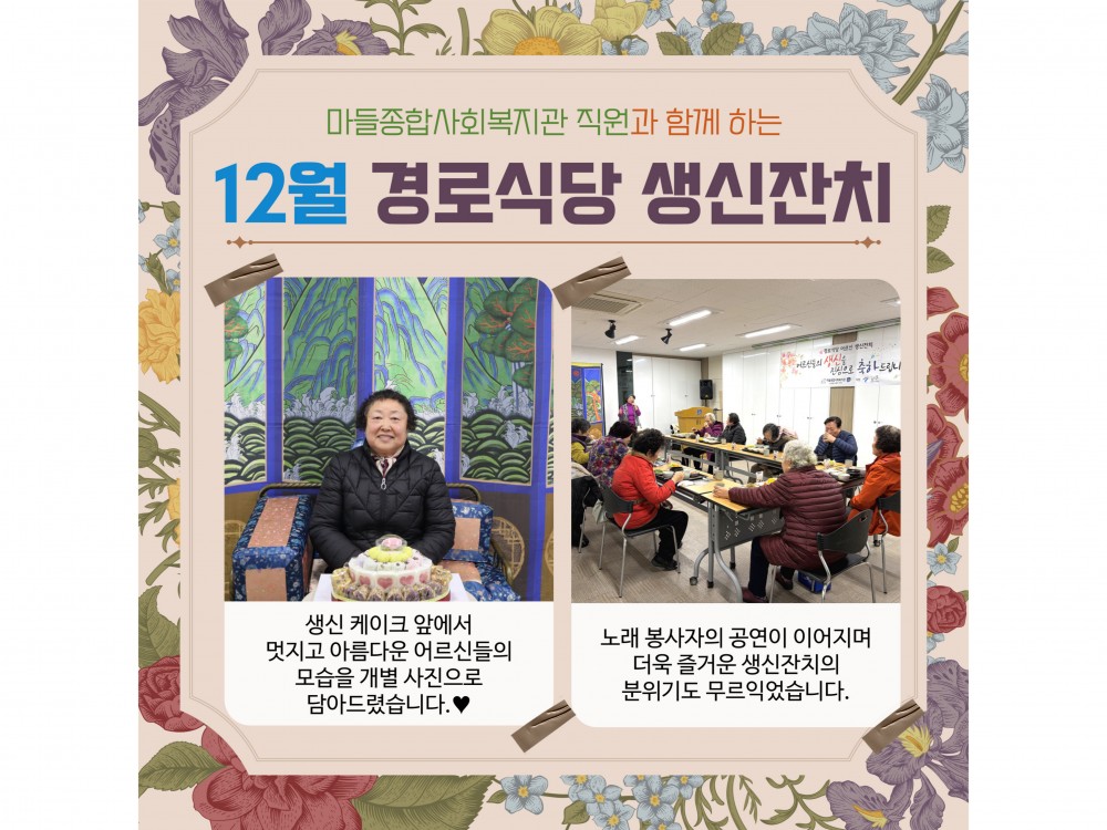 12월 경로식당 생신잔치 "함께라서 더 행복한 생일" 페이지 정보 작성자 서비스팀 작성일25-12-17 19:48 조회151회 댓글0건 관련링크 이전글 다음글 목록 본문 #크리스마스 #붕세권 #연말* 이 디자인은 미리캔버스에서 작업되었습니다.(https://www.miricanvas.com) 댓글목록 등록된 댓글이 없습니다. 이전글 다음글 목록