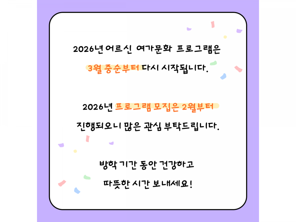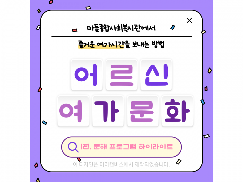 마들금빛대학 문해프로그램 하이라이트 페이지 정보 작성자 서비스팀 작성일25-12-23 14:51 조회94회 댓글0건 관련링크 이전글 다음글 목록 본문 #크리스마스 #붕세권 #연말* 이 디자인은 미리캔버스에서 작업되었습니다.(https://www.miricanvas.com) 댓글목록 등록된 댓글이 없습니다. 이전글 다음글 목록