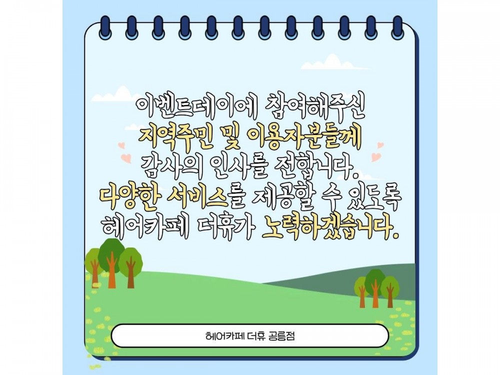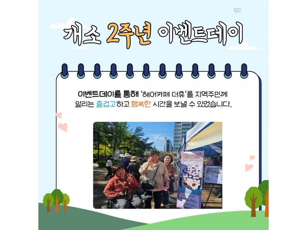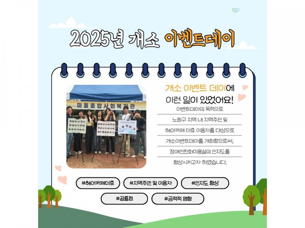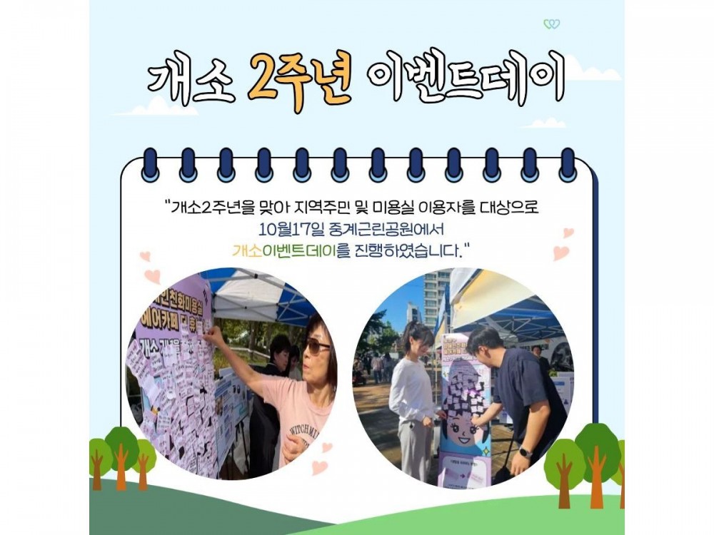 장애인친화미용실(공릉점) 개소2주년 이벤트데이 페이지 정보 작성자 시설운영팀 작성일25-10-24 00:20 조회48회 댓글0건 관련링크 이전글 다음글 목록 본문 댓글목록 등록된 댓글이 없습니다. 이전글 다음글 목록