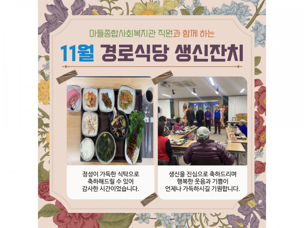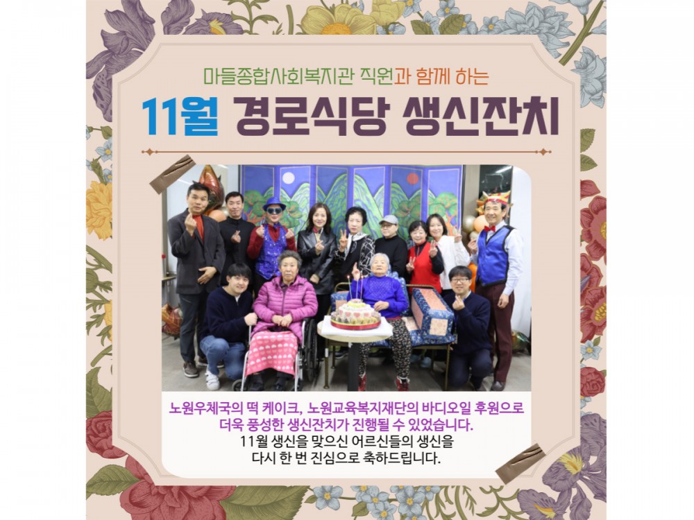 11월 경로식당 생신잔치 "함께라서 더 행복한 생일" 페이지 정보 작성자 서비스팀 작성일25-11-20 20:37 조회20회 댓글0건 관련링크 이전글 다음글 목록 본문 * 이 디자인은 미리캔버스에서 작업되었습니다.(https://www.miricanvas.com) 댓글목록 등록된 댓글이 없습니다. 이전글 다음글 목록