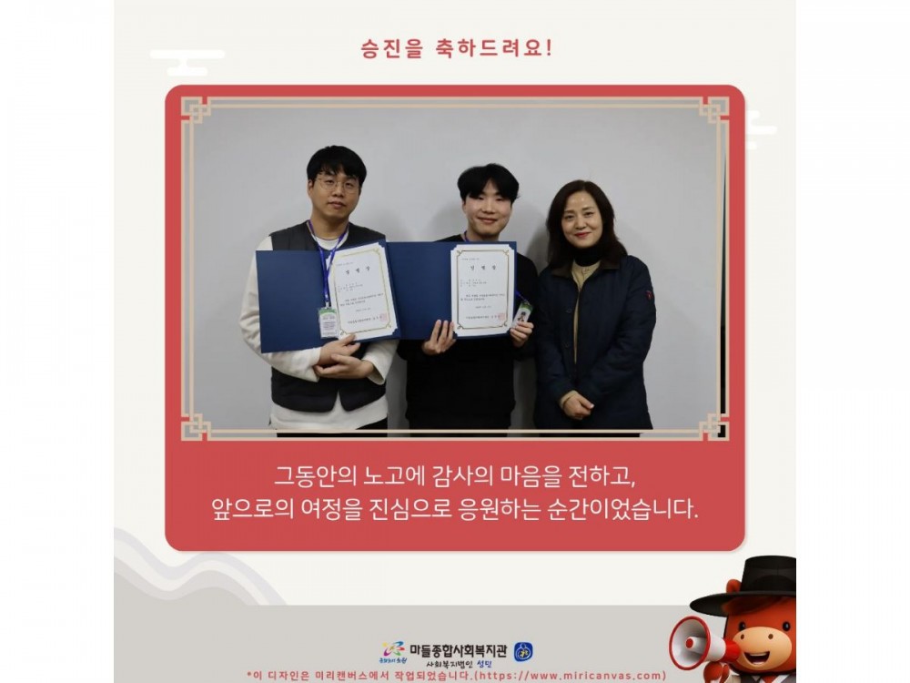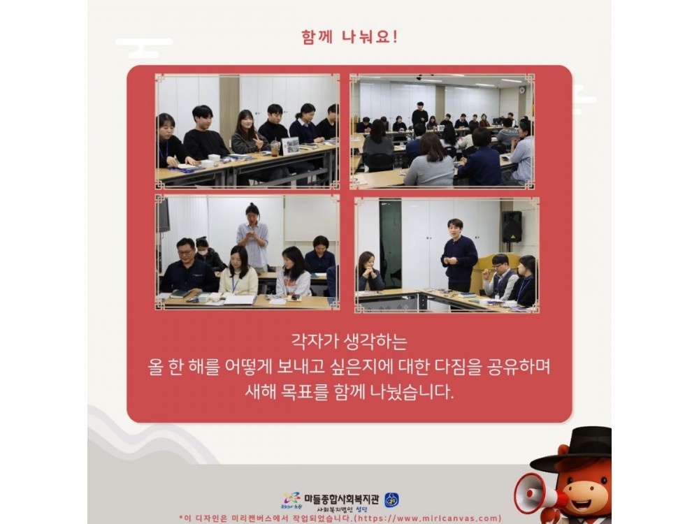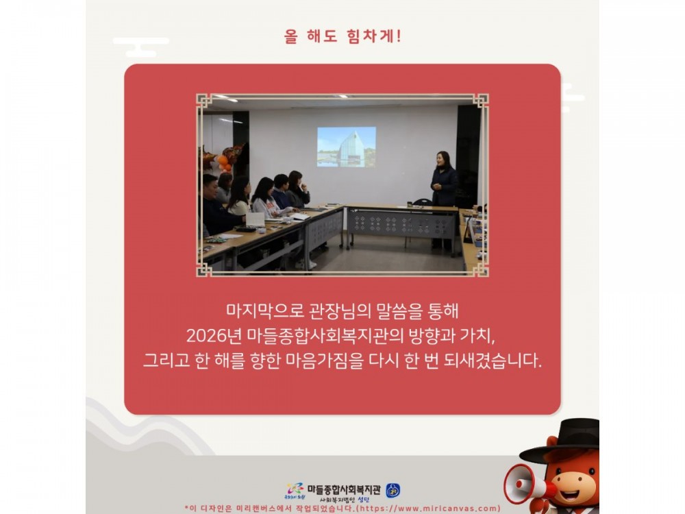 2026년 마들종합사회복지관 시무식 페이지 정보 작성자 경영지원팀 작성일26-01-05 21:57 조회169회 댓글0건 관련링크 이전글 다음글 목록 본문 댓글목록 등록된 댓글이 없습니다. 이전글 다음글 목록