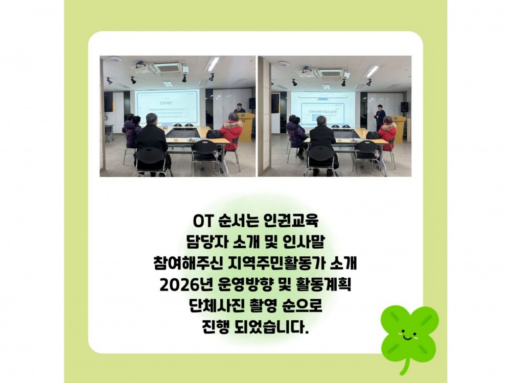 2026년 지역밀착형사회복지관사업 주민활동가 OT 페이지 정보 작성자 사례지원팀 작성일26-01-30 17:44 조회8회 댓글0건 관련링크 다음글 목록 본문 #명절 #입학 #봄* 이 디자인은 미리캔버스에서 작업되었습니다.(https://www.miricanvas.com) 댓글목록 등록된 댓글이 없습니다. 다음글 목록