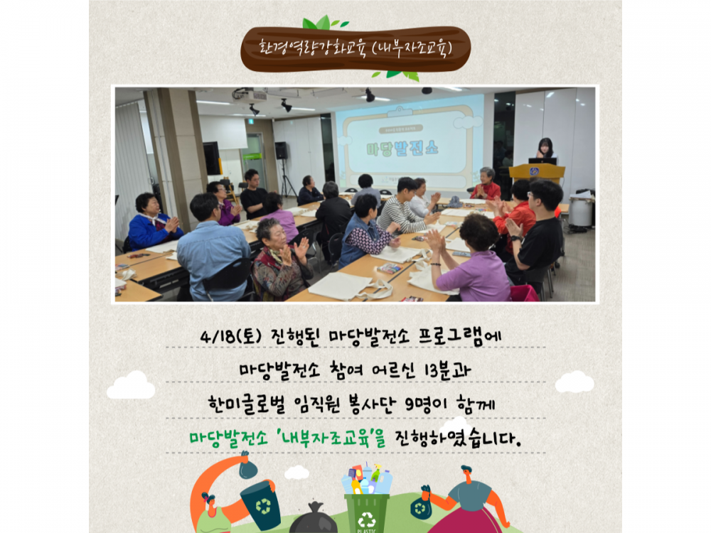 4월 마당발전소 활동 페이지 정보 작성자 지역사회조직팀 작성일26-04-23 11:45 조회59회 댓글0건 관련링크 이전글 다음글 목록 본문 #벚꽃 명소 #미세먼지 #한강* 이 디자인은 미리캔버스에서 작업되었습니다.(https://www.miricanvas.com) 댓글목록 등록된 댓글이 없습니다. 이전글 다음글 목록