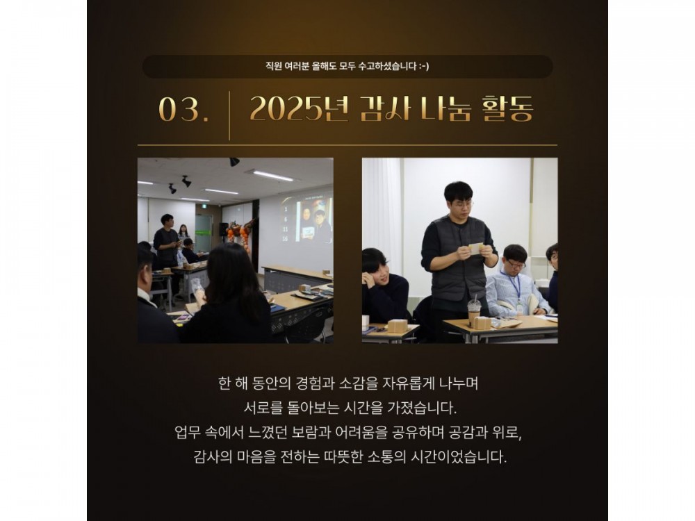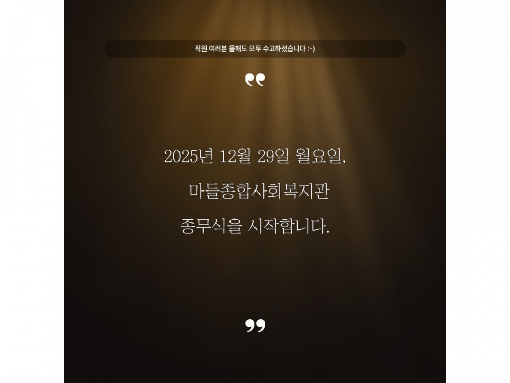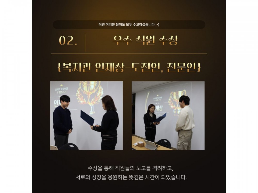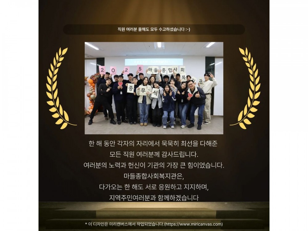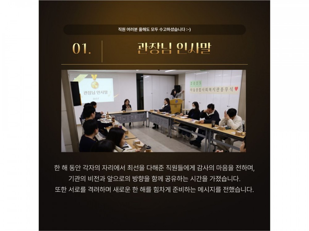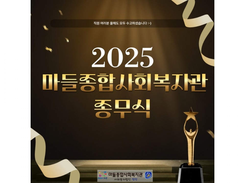 2025년 마들종합사회복지관 종무식 페이지 정보 작성자 경영지원팀 작성일25-12-31 17:10 조회190회 댓글0건 관련링크 이전글 다음글 목록 본문 댓글목록 등록된 댓글이 없습니다. 이전글 다음글 목록