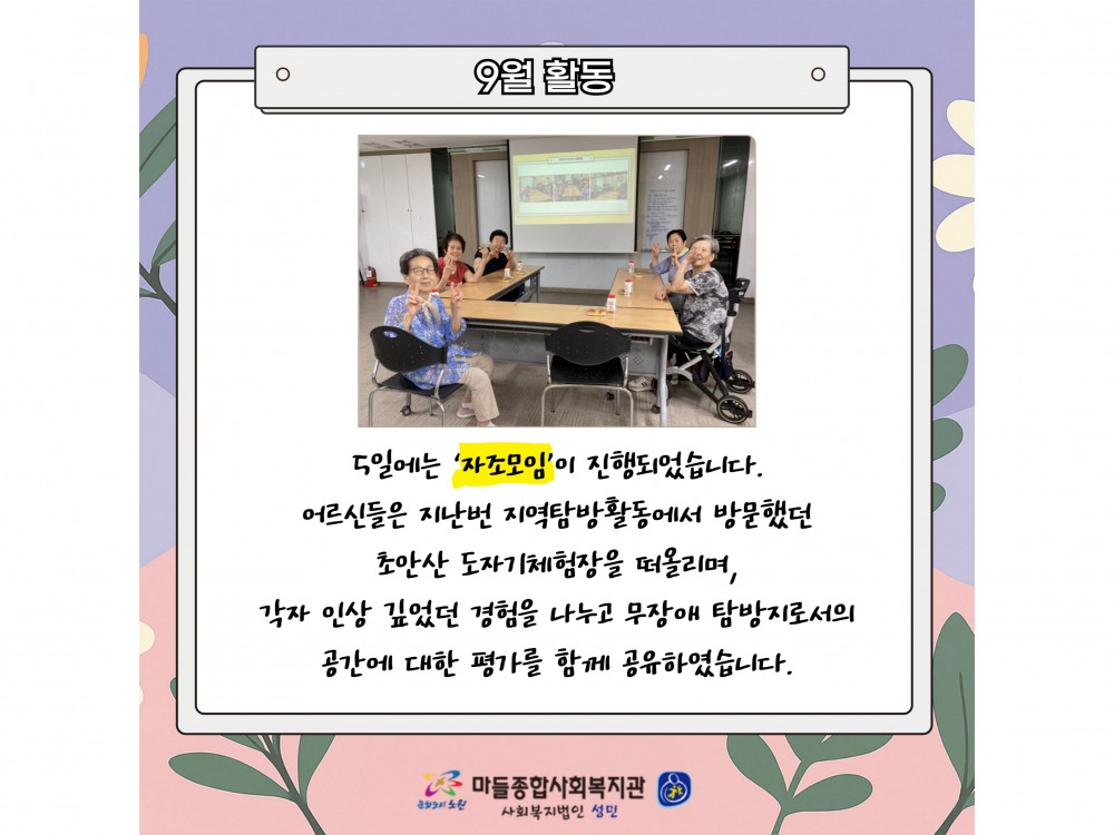 거동불편어르신 문화지원사업 '한걸음가치' 9월 활동 페이지 정보 작성자 서비스1팀 작성일25-09-30 19:37 조회99회 댓글0건 관련링크 이전글 다음글 목록 본문 #단풍 #추석 #명절* 이 디자인은 미리캔버스에서 작업되었습니다.(https://www.miricanvas.com) 댓글목록 등록된 댓글이 없습니다. 이전글 다음글 목록