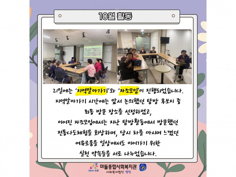 거동불편어르신 문화지원사업 '한걸음가치' 10월 활동 페이지 정보 작성자 서비스1팀 작성일25-10-30 16:47 조회30회 댓글0건 관련링크 이전글 다음글 목록 본문 #단풍 #추석#명절* 이 디자인은 미리캔버스에서 작업되었습니다.(https://www.miricanvas.com) 댓글목록 등록된 댓글이 없습니다. 이전글 다음글 목록