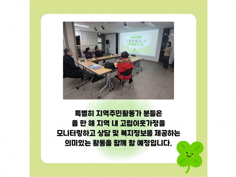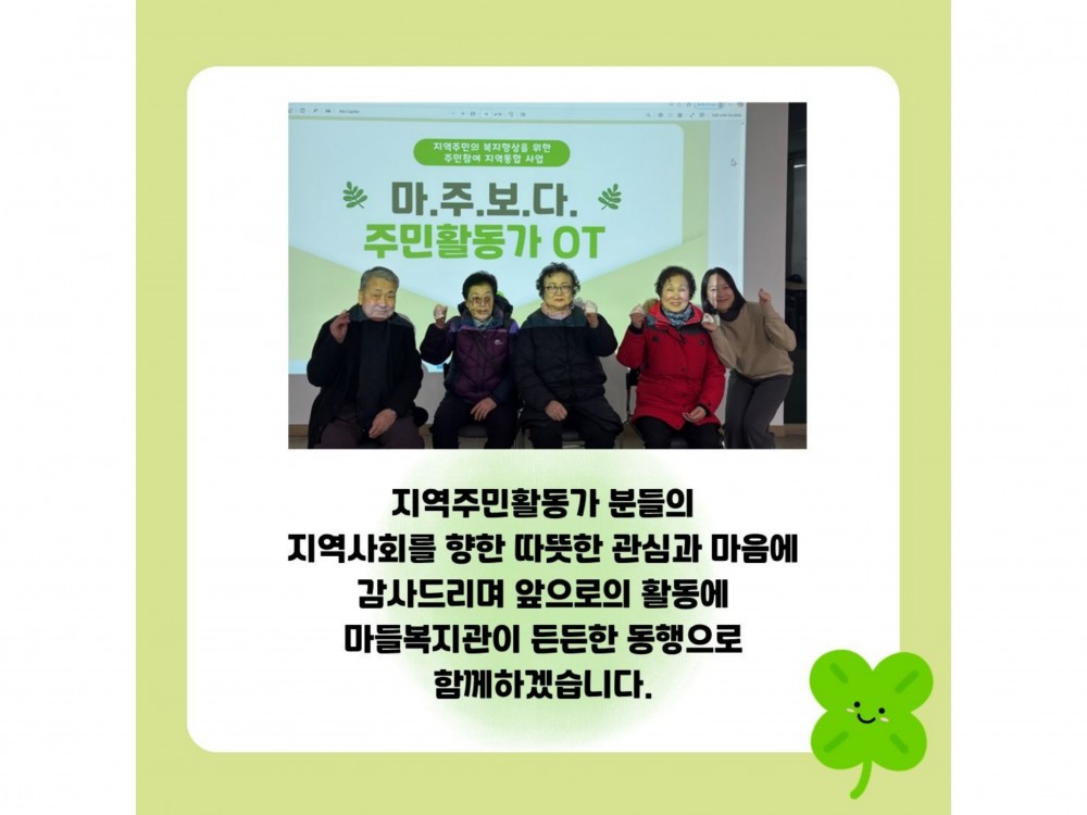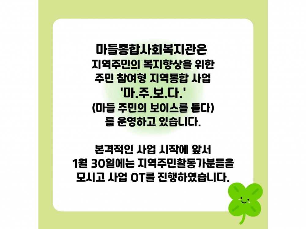 2026년 지역밀착형사회복지관사업 주민활동가 OT 페이지 정보 작성자 사례지원팀 작성일26-01-30 17:44 조회94회 댓글0건 관련링크 이전글 다음글 목록 본문 #명절 #입학 #봄* 이 디자인은 미리캔버스에서 작업되었습니다.(https://www.miricanvas.com) 댓글목록 등록된 댓글이 없습니다. 이전글 다음글 목록